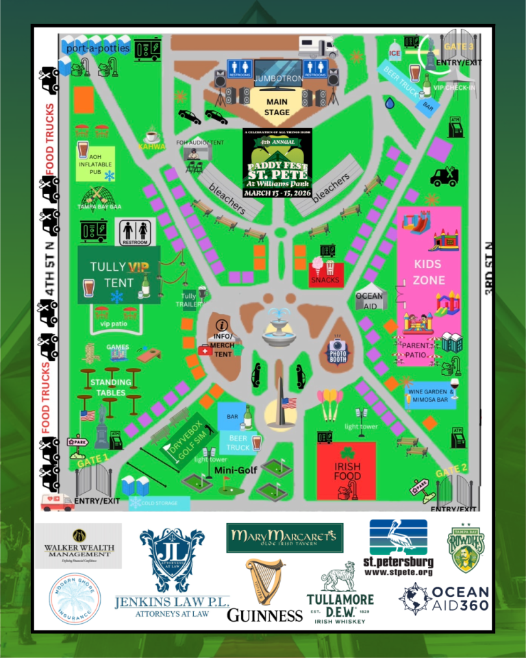 Your ticket gives you access to a full day of live Irish music, headlining performances, cultural entertainment, vendors, food trucks, and immersive festival experiences throughout Williams Park.